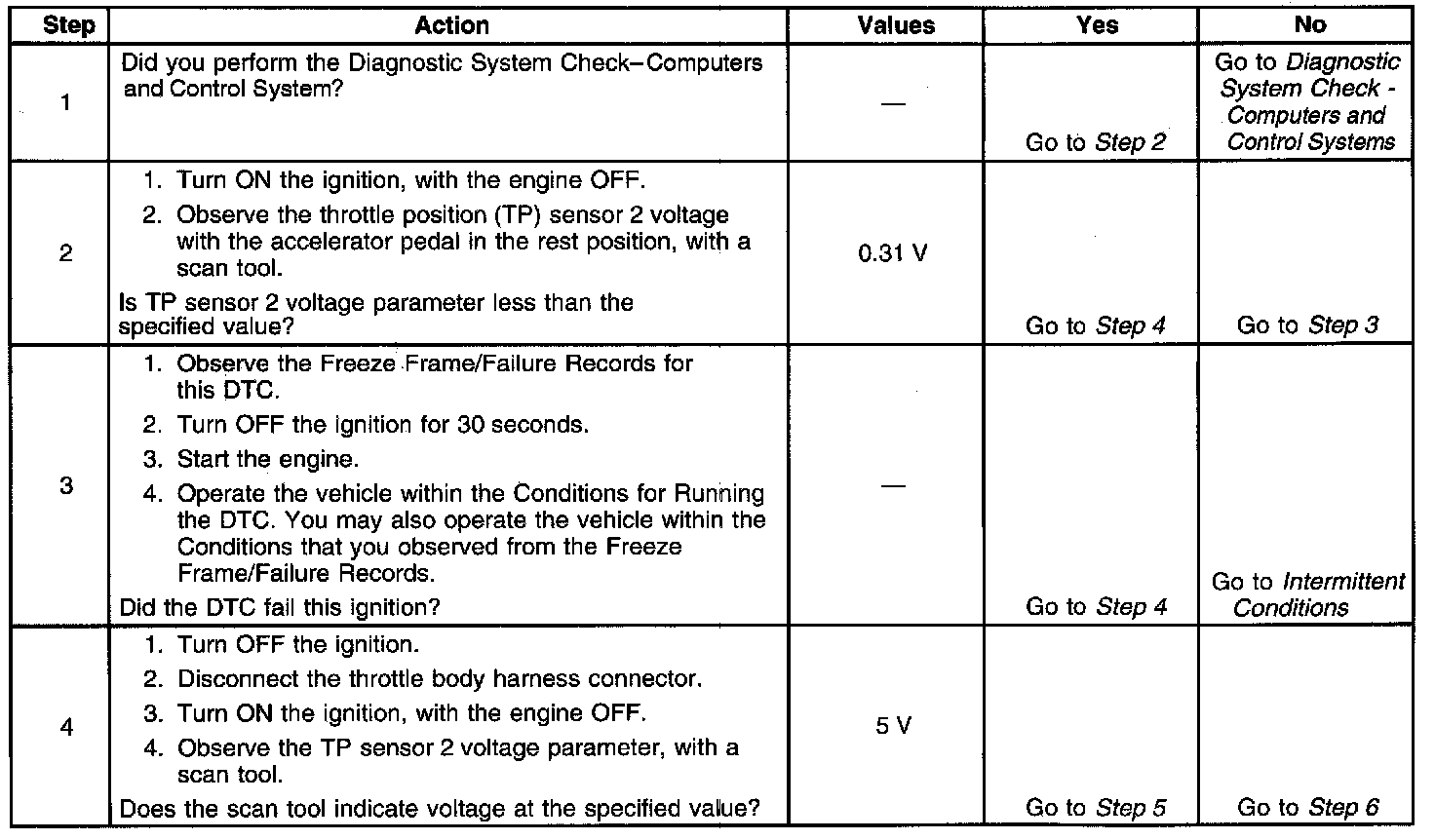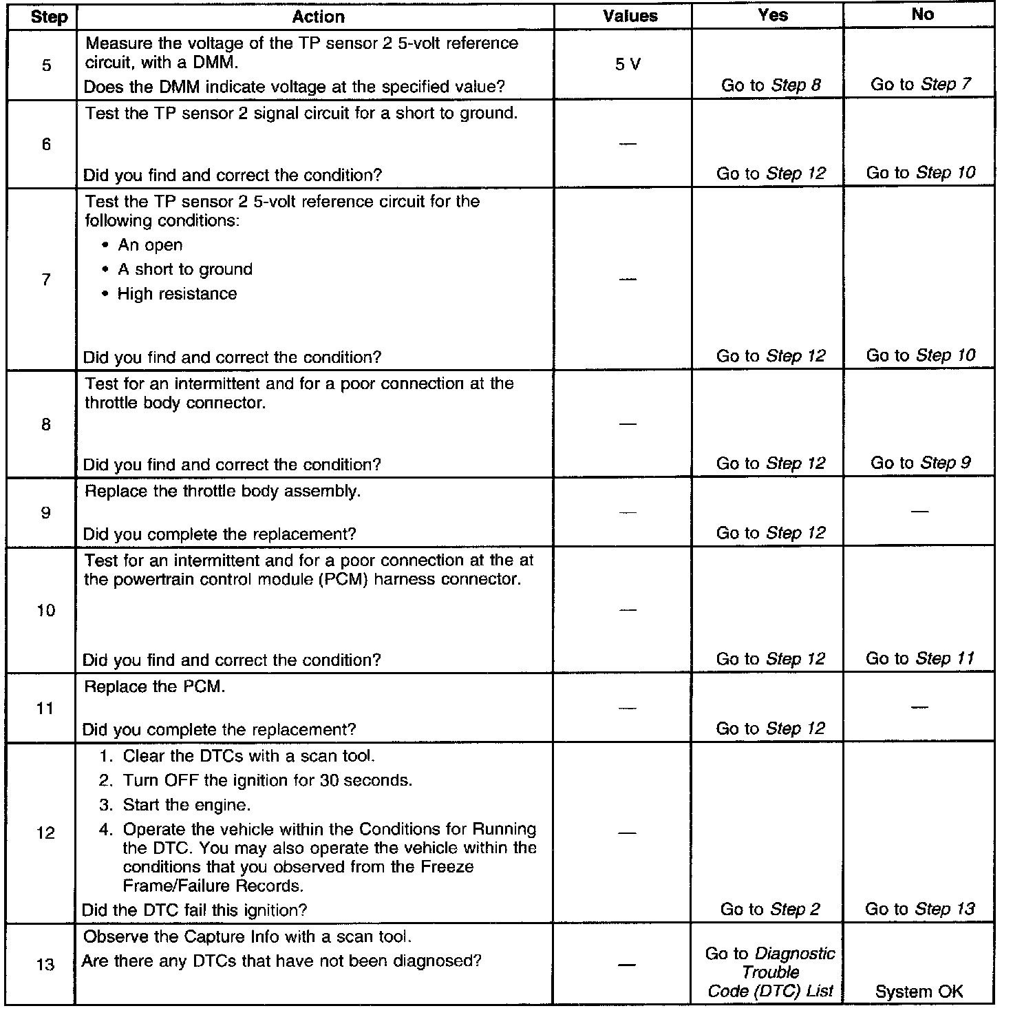 This provides the powertrain control module (PCM) with a signal voltage proportional to throttle plate movement. TP sensor 1 signal voltage at closed throttle is near the 5-volt reference and decreases as the throttle plate is opened. TP sensor 2 signal voltage at closed throttle is near the low reference and increases as the throttle plate is opened. If the PCM detects that the TP sensor 2 signal voltage is less than the predicted range, DTC P0222 sets.