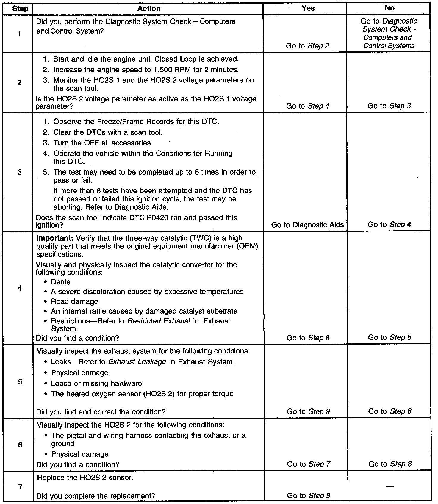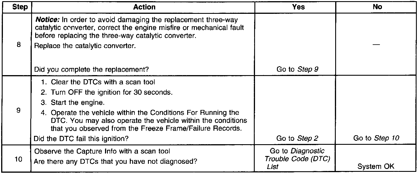 A three-way catalytic (TWC) converter controls emissions of hydrocarbons (HG), carbon monoxide (CO), and oxides of nitrogen (NOx). The catalyst within the converter promotes a chemical reaction which oxidizes the HC and the CO that are present in the exhaust gas. This process converts the HG and the CO into water vapor and carbon dioxide (CO2), and reduces the NOx, converting the NOx into nitrogen. The catalytic converter also stores oxygen. The powertrain control module (PCM) monitors this process by using a heated oxygen sensor (H028) that is in the exhaust stream after the TWC. This HO2S 2, also referred to as the catalyst monitor sensor, produces an output signal that the PCM uses to calculate the oxygen storage capacity of the catalyst. This indicates the ability of the catalyst to convert the exhaust emissions efficiently. The PCM monitors the efficiency of the catalyst by allowing the catalyst to heat, then wait for a stabilization period while the engine is idling. The PCM then adds and removes fuel while monitoring the HO2S 2. When the catalyst is functioning properly, the HO2S 2 response to the extra fuel is slow compared to the response of the HO2S 1, which is located before the TWC. When the HO2S 2 response is near that of the HO2S 1, the oxygen storage capability and efficiency of the catalyst is considered to be degraded below an acceptable threshold. If the PCM detects the degraded condition, DTC P0420 sets.