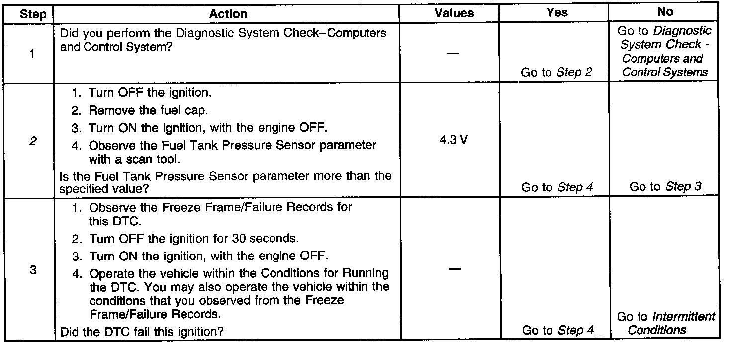The fuel tank pressure (FTP) sensor measures the difference between the air pressure or vacuum in the evaporative emission (EVAP) system, and the outside air pressure. The control module supplies a 5-volt reference and a low reference circuit to the FTP sensor. The FTP sensor signal circuit voltage varies depending on EVAP system pressure or vacuum. If the FTP sensor signal voltage increases above a calibrated value, this DTC sets.