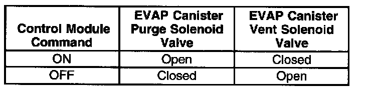 The table illustrates the relationship between the ON and OFF states, and the Open or Closed states of the EVAP canister purge and vent solenoid valves.