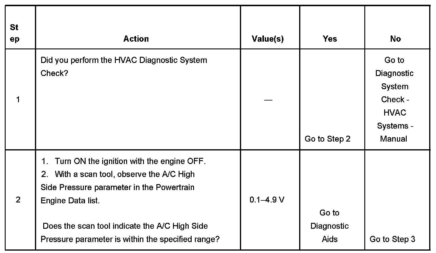 - The A/C refrigerant pressure sensor signal is greater than 4.9 volts for 5 seconds.