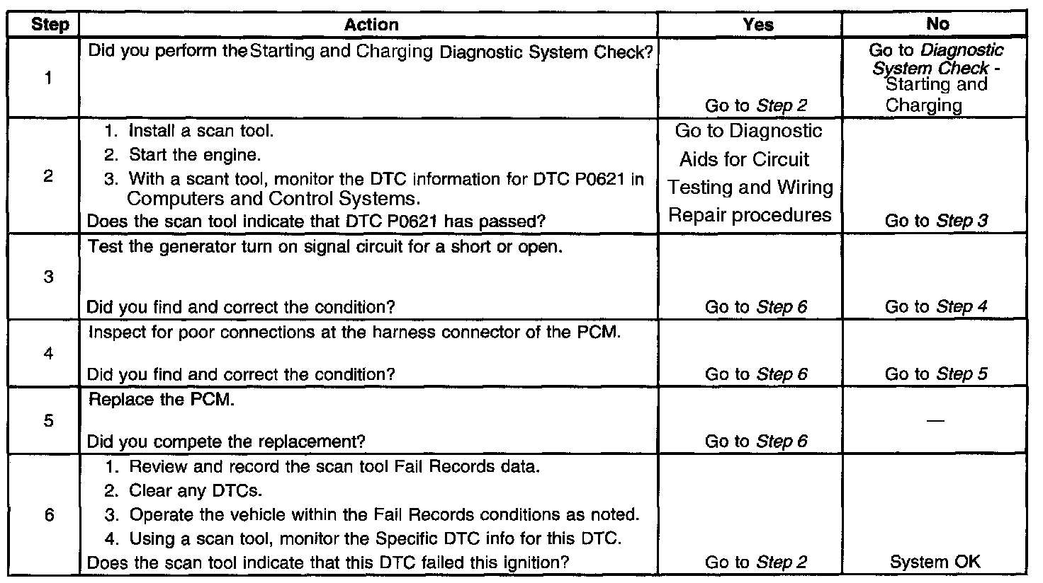 The PCM monitors the state of the generator turn on signal circuit. The PCM should detect a low generator turn on signal circuit voltage when the key is ON and the engine is OFF, or when the charging system malfunctions. With the engine running, the PCM should detect a high generator turn on signal circuit. The PCM performs key ON and RUN tests to determine the status of the generator turn on signal circuit. During the key ON test, if the PCM detects a high generator turn on signal circuit voltage, DTC P0621 will set. DTC P0621 will also set if, during the RUN test, the PCM detects a low generator turn on signal circuit. When the DTC sets, the PCM will send a class 2 serial data message to the IPC to illuminate the charge indicator.