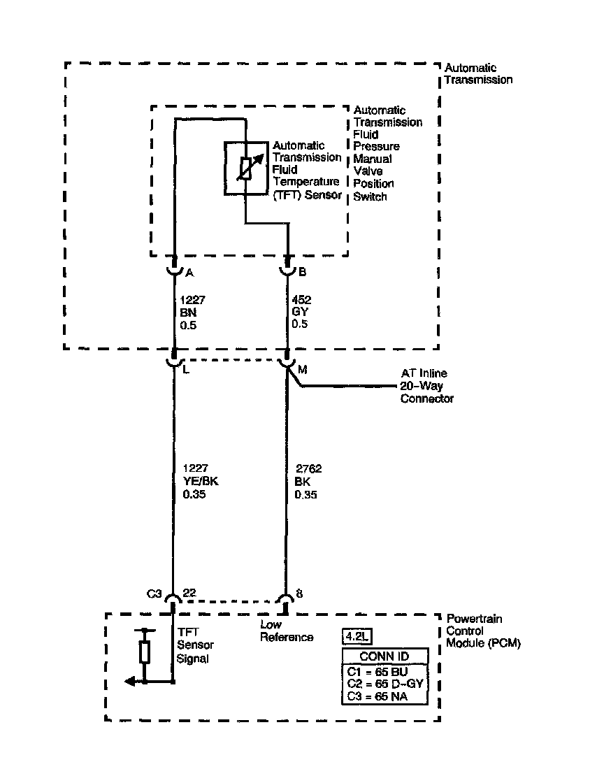 The automatic Transmission Fluid Temperature (TFT) sensor is part of the automatic Transmission Fluid Pressure (TFP) manual valve position switch. The TFT sensor is a resistor, or thermistor, which changes value based on temperature. The sensor has a negative-temperature coefficient. This means that as the temperature increases, the resistance decreases, and as the temperature decreases, the resistance increases. The Powertrain Control Module (PCM) supplies a 5-volt reference signal to the sensor on the TFT sensor signal circuit and measures the voltage drop in the circuit. When the transmission fluid is cold, the sensor resistance is high and the PCM detects high signal voltage. As the fluid temperature warms to a normal operating temperature, the resistance becomes less and the signal voltage decreases. The PCM uses this information to control shift quality and torque converter clutch apply.