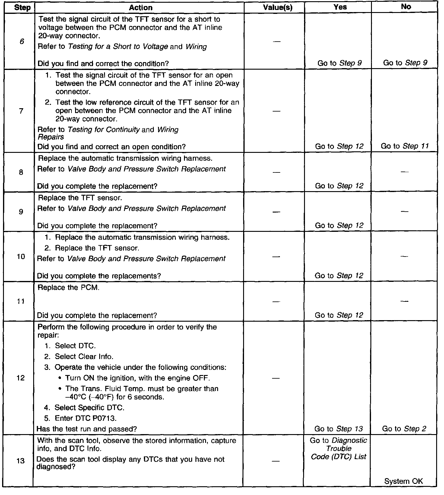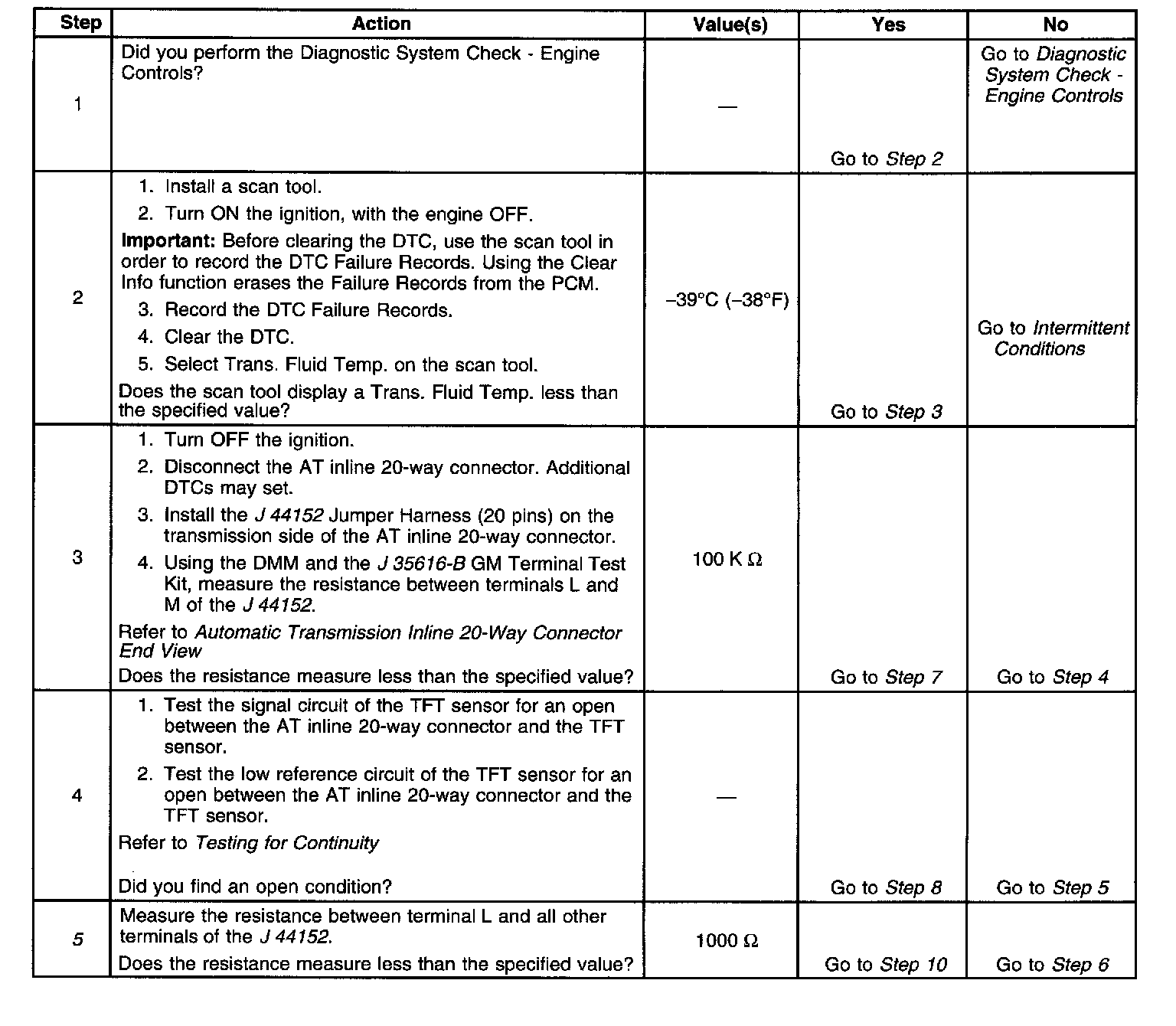 5. This step tests the TFT sensor signal circuit for being shorted to another circuit within the transmission. If the TFT sensor signal circuit shorts to another circuit, which is carrying voltage greater than five volts, the TFT sensor would become open.