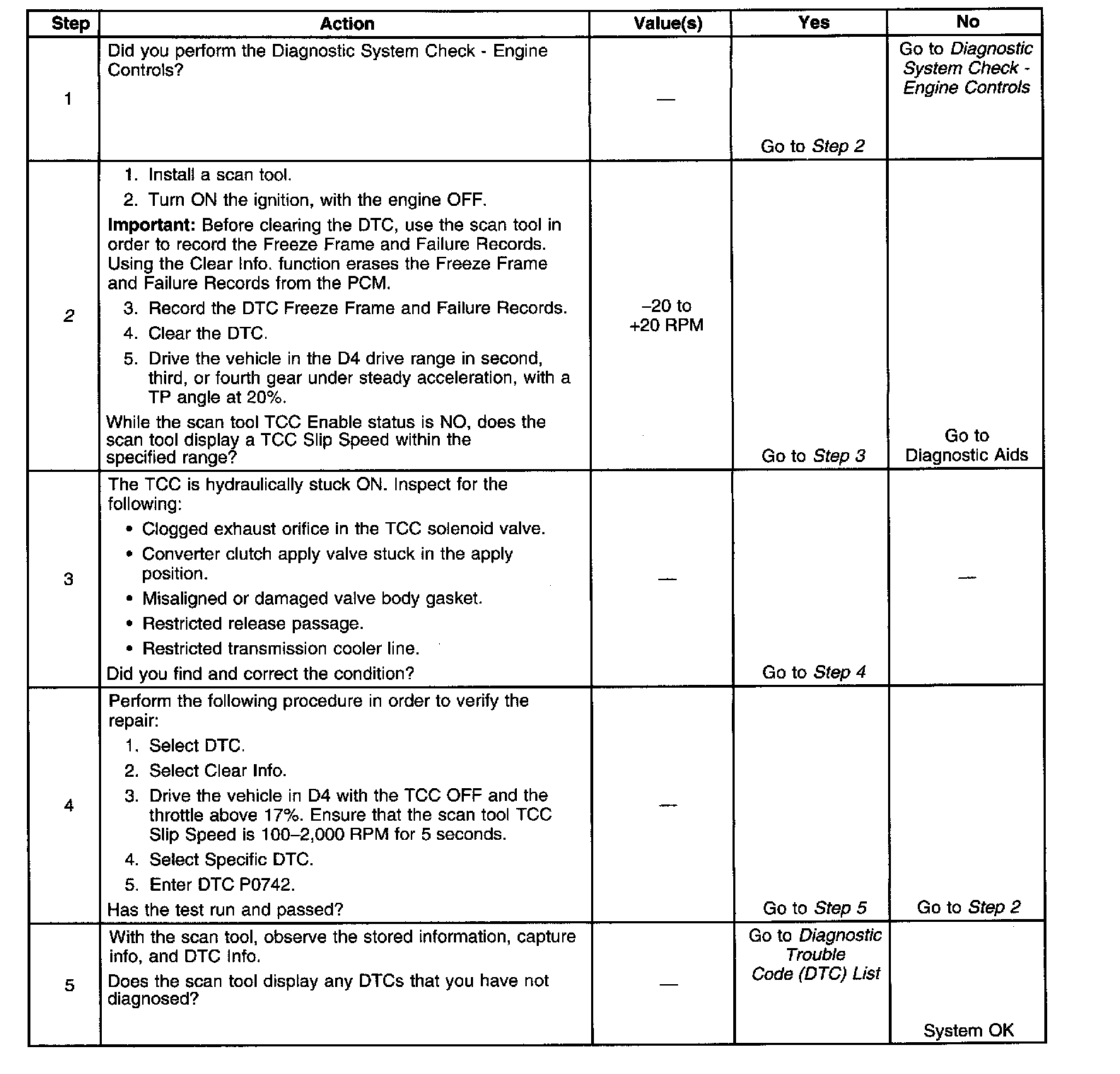 When the PCM detects low TCC slip when the TCC is commanded OFF, then DTC P0742 sets. DTC P0742 is a type B DTC.