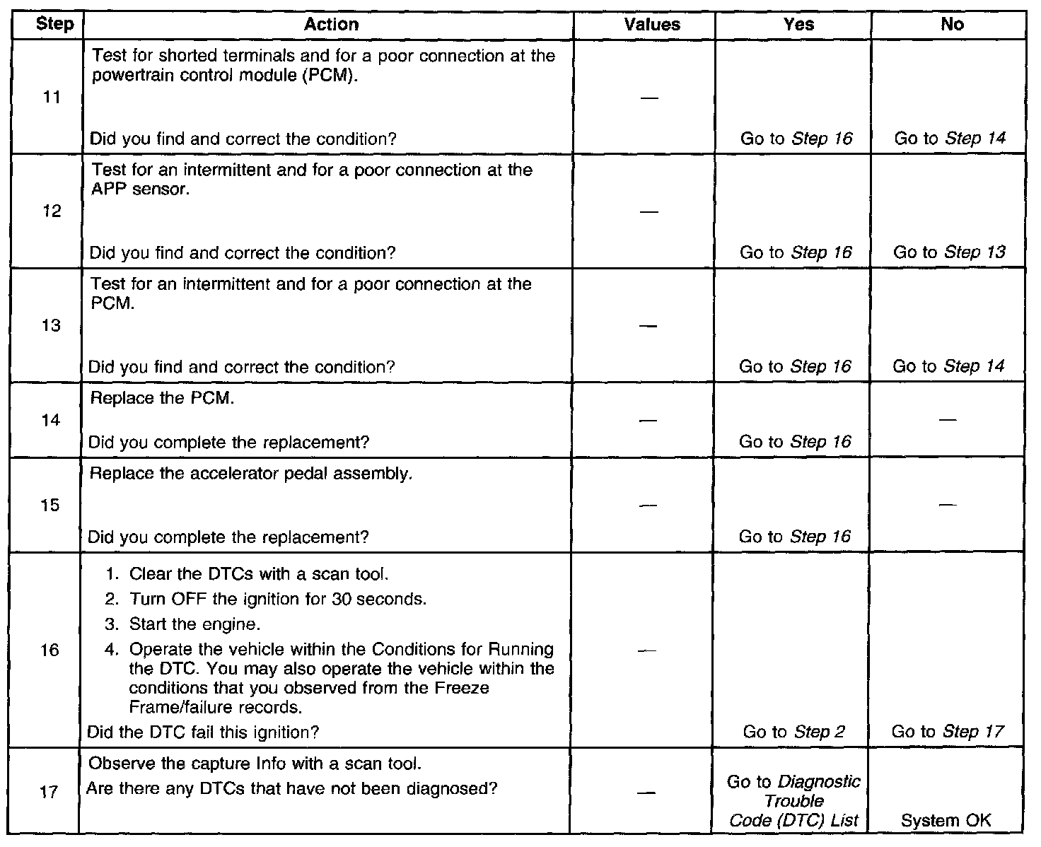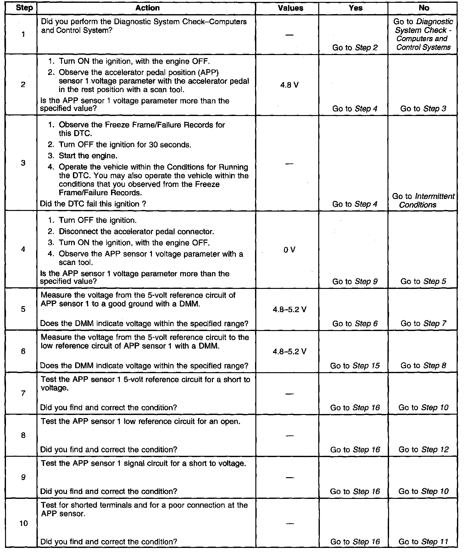 This provides the powertrain control module (PCM) with a signal voltage proportional to accelerator pedal movement. The APP sensor 1 signal voltage at rest position is near the low reference and increases as the pedal is actuated. The APP sensor 2 signal voltage at rest position is near the 5-volt reference and decreases as the pedal is actuated. If the PCM detects the APP sensor 1 signal voltage is not within the predicted range, DTC P2123 sets.
