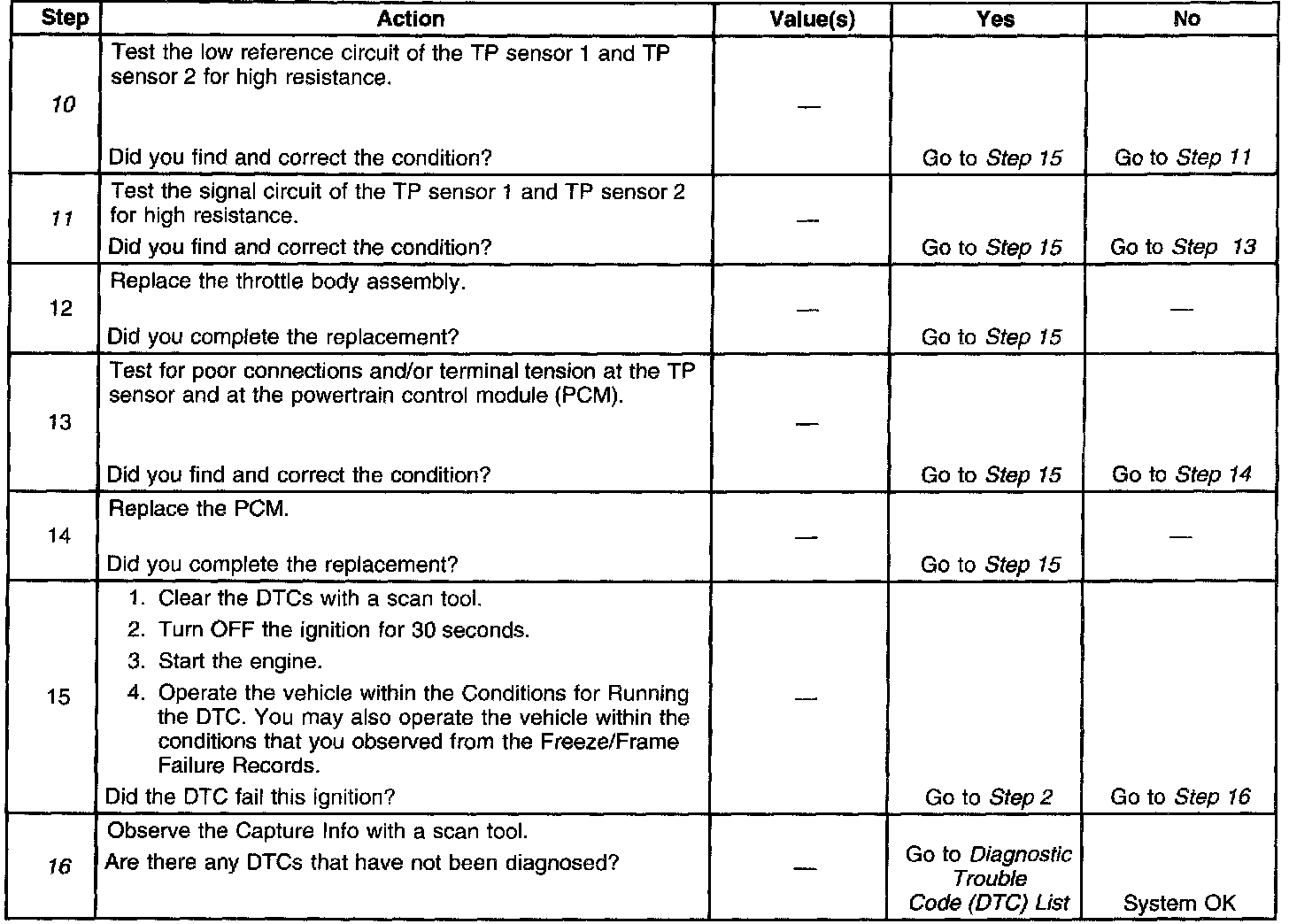 11. This step checks for the TP sensor signal circuits for being shorted to another circuit in the PCM wiring harness between the PCM and the TP sensor wiring harness.