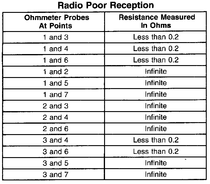 Use the appropriate chart and diagram to test the antenna coaxial cable resistances for the antenna system on the vehicle. Refer to the table when testing the antenna and/or lead-in cable.