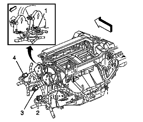 19. Connect the defroster (4), air conditioning (3), and drivers side temperature valve (2) electrical connectors to the HVAC actuators.