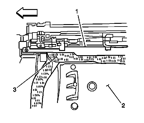 5. Flex the center of the sunshade (2) upward while simultaneously sliding the panel sideways to release the retaining tabs (3) from the track slot (1).