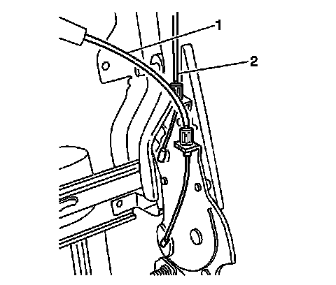 6. Remove the latch release cable (1), and the head rest restraint cable (2) from the left-hand hinge bracket.