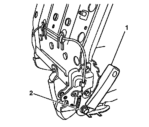 3. Install the seat belt side buckle (1) to the seat with the seat belt anchor nut (2), if replacing the right-hand seat inboard hinge.