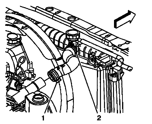7. Remove the inlet radiator hose clamps (1) and remove hoses (2).