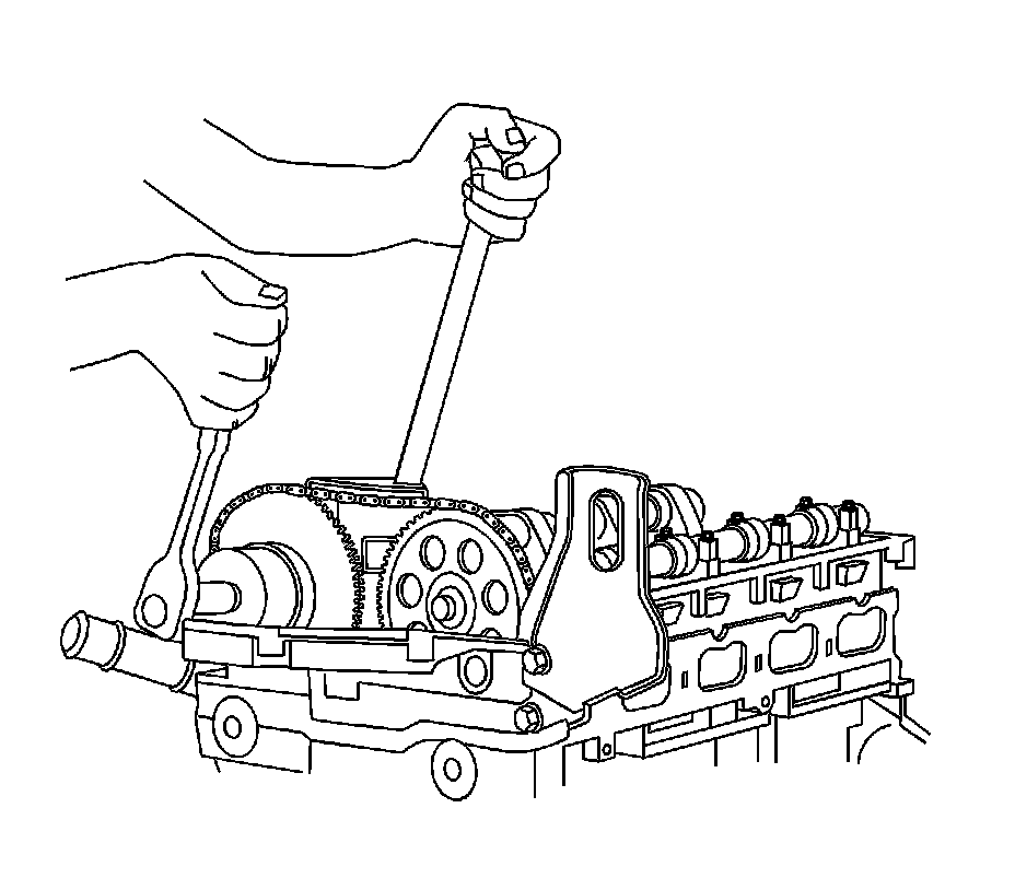Important: Use a 25 mm (1 in) open end wrench on the camshaft hexes to hold the camshaft from turning. It is critical that the crankshaft does not move and is held at TDC when the intake and exhaust camshaft sprocket bolts are removed.