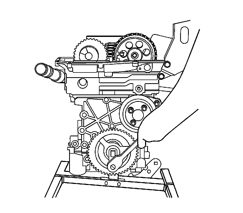 20. Rotate the engine clockwise by hand two complete revolutions to TDC number 1 on the compression stroke. Refer to First Method or Second Method for TDC. If you go past TDC, rotate the engine back approximately 45 degrees before TDC and then rotate clockwise up to TDC to ensure that the timing chain is tight (no slack) between the crank sprocket and the timing gears.