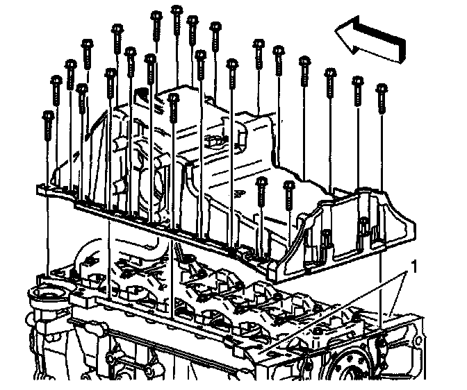 3. Install two of the oil pan bolts into the threaded holes back bolts to break the seal of oil pan (1).