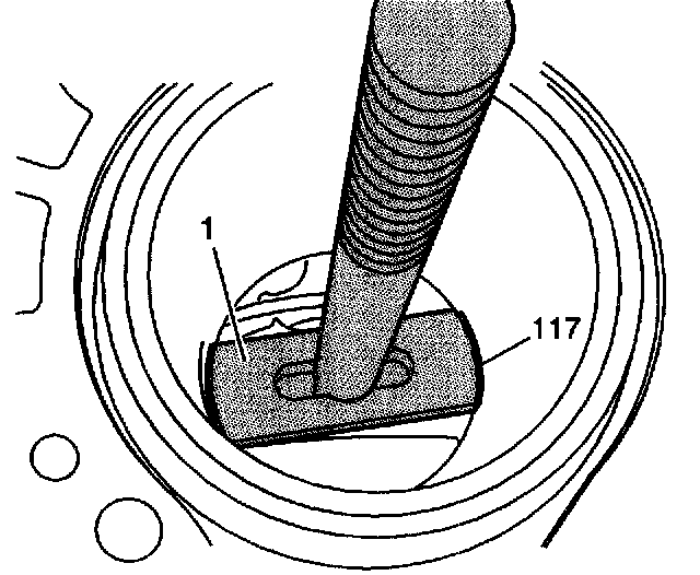 3. Align the shoe (1) of the cylinder bore liner puller EN 45680-402 to the bottom of the cylinder bore liner (117).