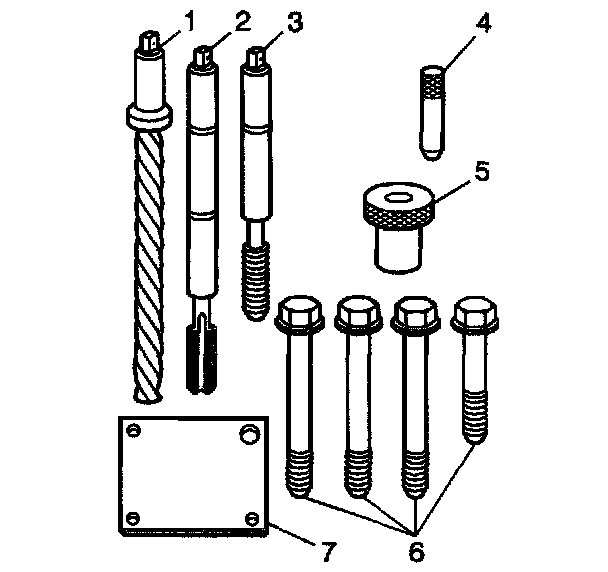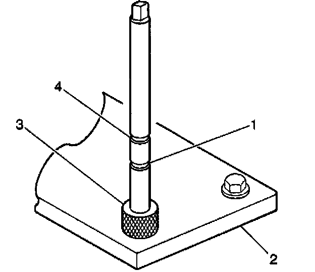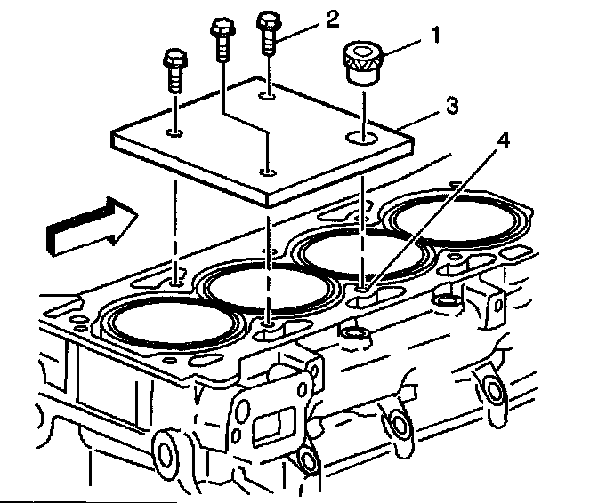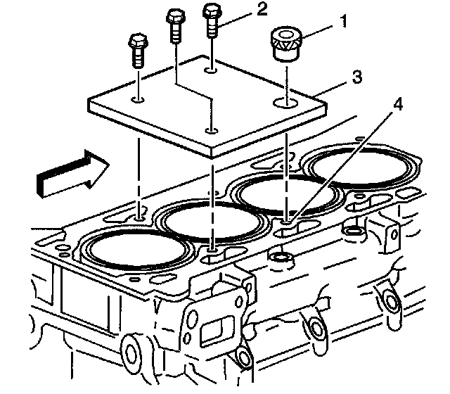 1. Position the fixture plate (3) with the bushing (1) installed over the cylinder head bolt hole to be repaired (4).