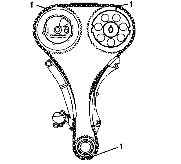 17. The dark links (1) on the chain should be aligned with marks on sprockets as shown.