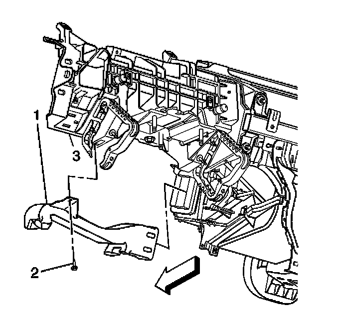 2. Remove the push pin (2) retaining the floor air outlet duct (1) to the heater module.