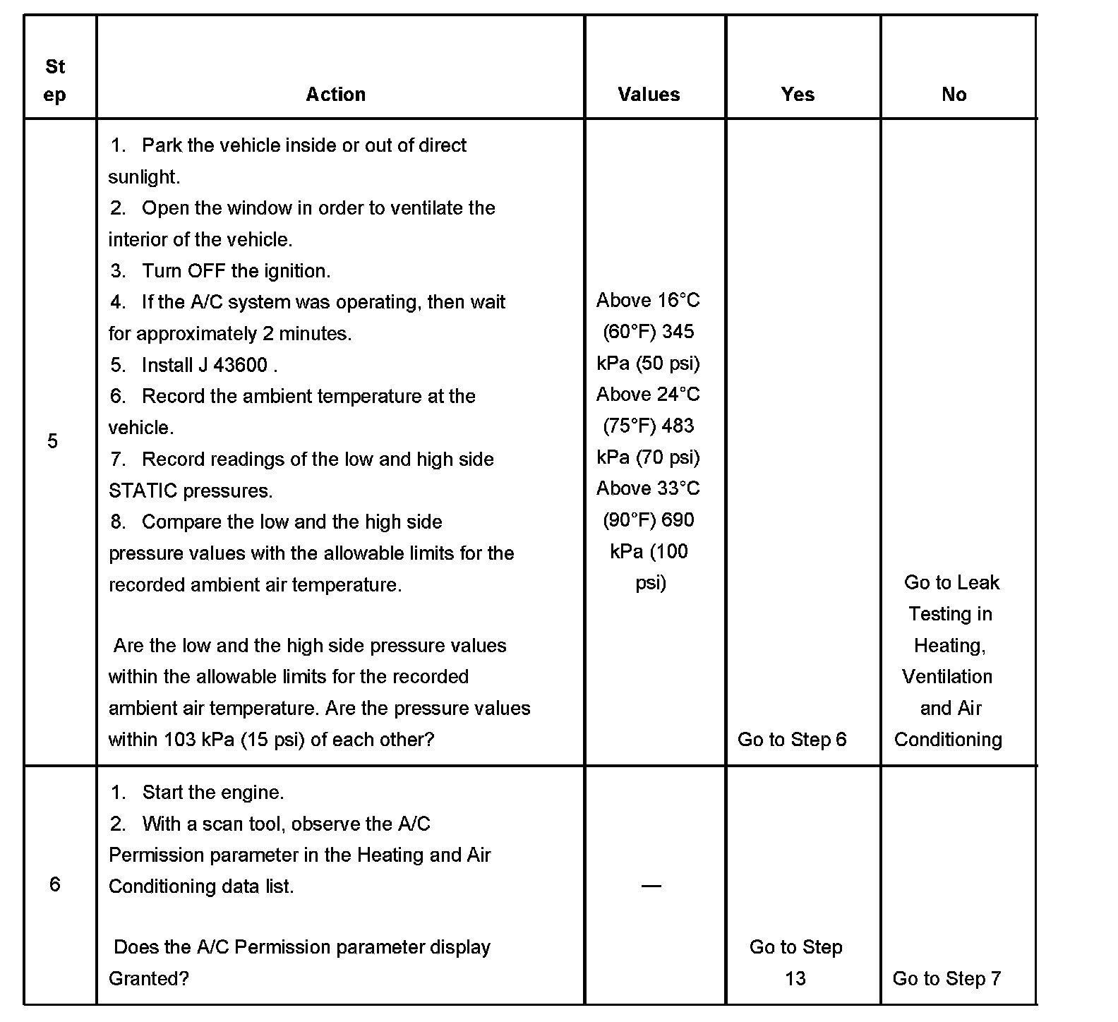 5. This test ensures that there is sufficient refrigerant in the A/C system. The specific values come from the A/C System Performance Test in Heating, Ventilation and Air Conditioning.