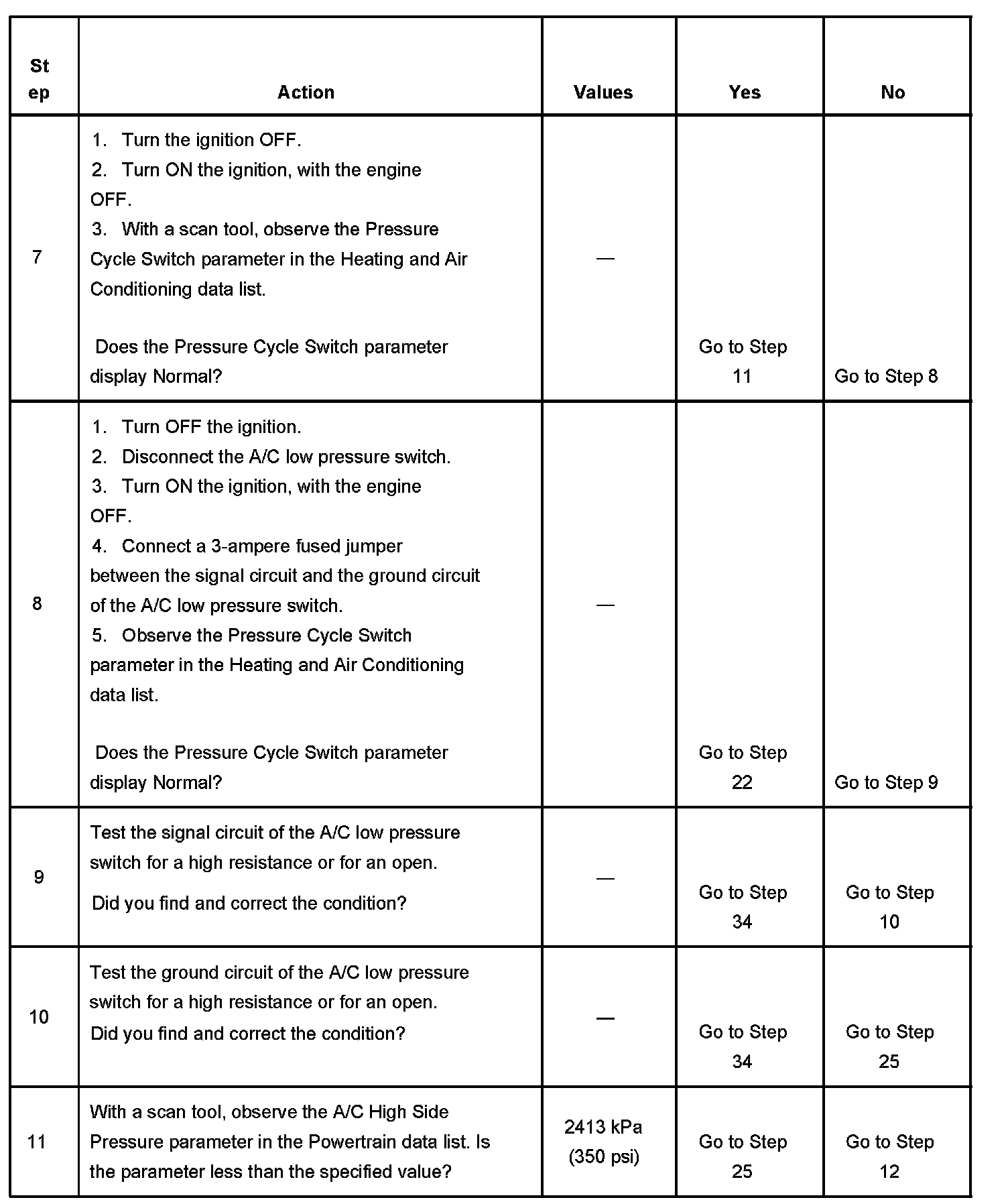 7. The A/C low pressure switch parameter is out of range when the HVAC control module interprets the signal being below 151 kPa (22 psi) or above 275 kPa (40 psi).