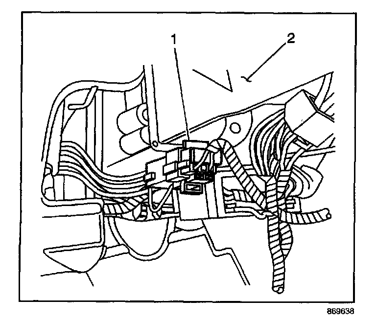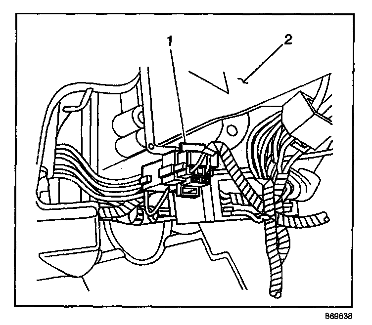 2. Connect the steering wheel module yellow 4-way connector (2) located left of the steering column near the knee bolster.