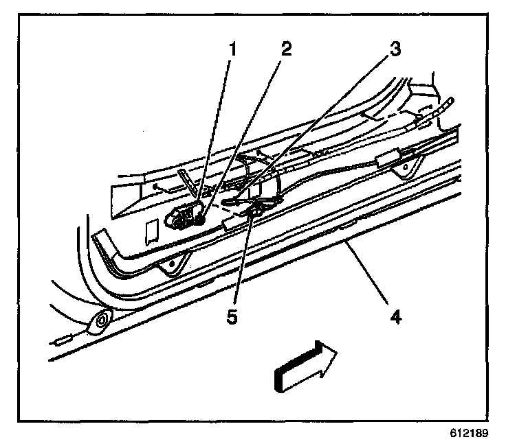 6. Remove the connector position assurance (CPA) (3) from the side impact sensor yellow 2-way connector (5) located near the bottom right of the door.
