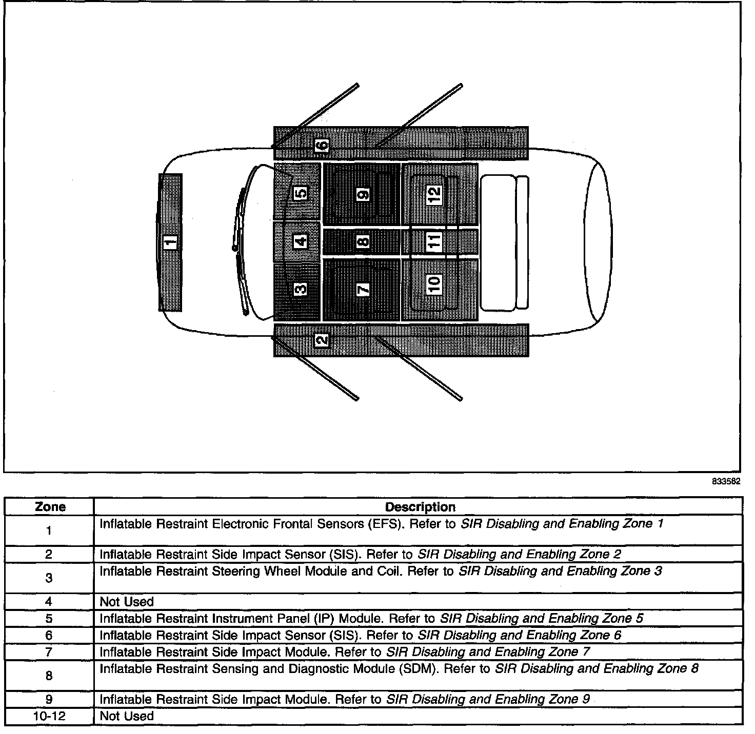 The SIR system has been divided into Disabling and Enabling Zones. When performing service on or near SIR components or SIR wiring, it may be necessary to disable the SIR components in that zone.