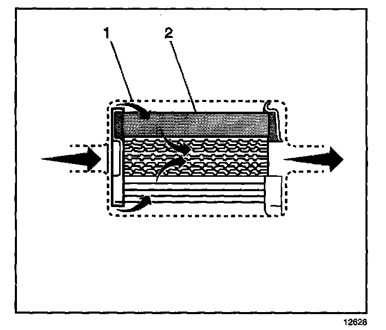 The fuel filter is located on the fuel feed pipe, between the fuel pump and the fuel injectors. The paper filter element (2) traps particles in the fuel that may damage the fuel injection system. The filter housing (1) is made to withstand maximum fuel system pressure, exposure to fuel additives, and changes in temperature.