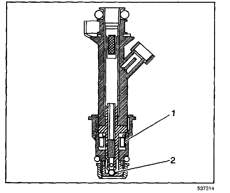 The Multec 2 fuel injector assembly is a solenoid device controlled by the control module that meters pressurized fuel to a single engine cylinder. The control module energizes the high-impedance, 12 ohms, injector solenoid (2) to open a normally closed ball valve (3). This allows fuel to flow into the top of the injector, past the ball valve, and through a director plate at the injector outlet. The director plate has four machined holes that control the fuel flow, generating a spray of finely atomized fuel at the injector tip. Fuel from the injector tip is directed at the intake valve, causing the fuel to become further atomized and vaporized before entering the combustion chamber. This fine atomization improves fuel economy and emissions.