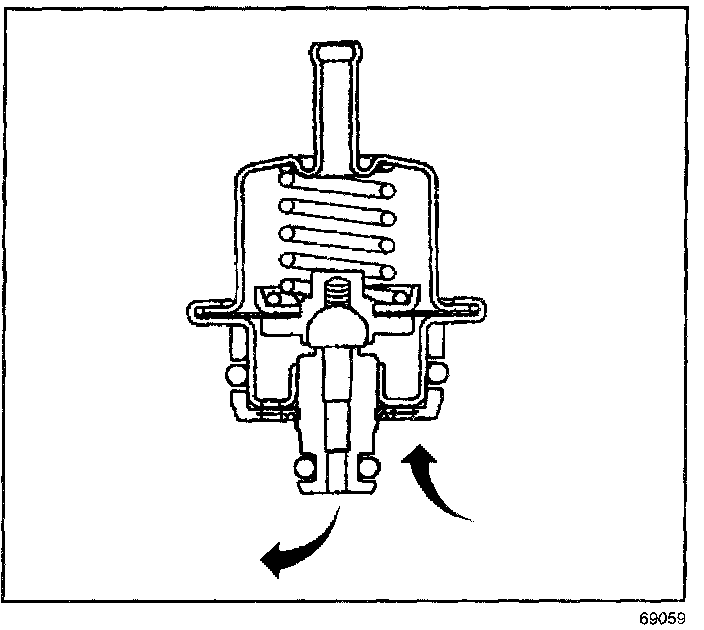 The fuel pressure regulator is a diaphragm relief valve. The diaphragm has fuel pressure on one side and regulator spring pressure on the other side. The fuel pressure regulator maintains a constant pressure differential across the fuel injectors under all operating conditions.