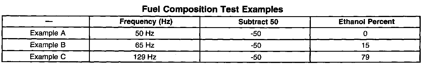 3. Subtract 50 from the reading on the DMM in order to obtain the percentage of alcohol in the fuel sample. Refer to the examples in the Fuel Composition Test Examples table.