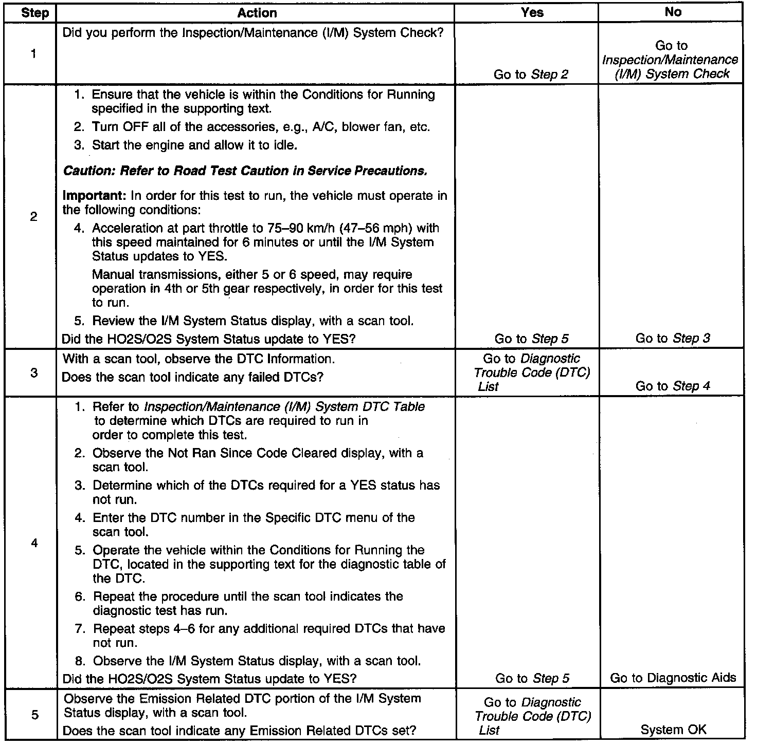 The I/M System Status does not indicate whether the test has passed or failed, only that a decision was made. When all of the diagnostics for a specific system have run and passed, the I/M System Status will update to YES. If a test for a specific system has failed, the I/M System Status will update to YES, indicating a determination was made, even if all of the required tests have not run. When a failure occurs, the Emission Related DTC portion of the I/M System
