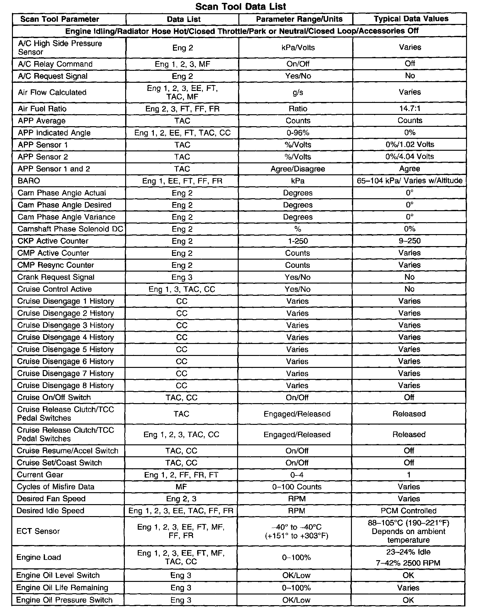 The Engine Scan Tool Data List contains all engine related parameters that are available on the scan tool. The list is arranged in alphabetical order. A given parameter may appear in any one of the data lists, and in some cases may appear more than once, or in more than one data list in order to group certain related parameters together.