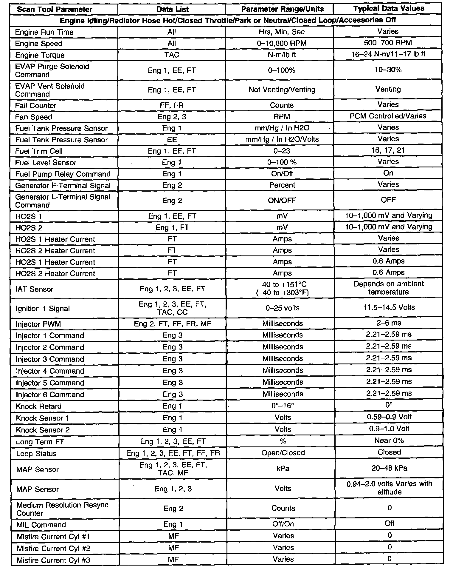 Scan tool values from a properly running engine may be used for comparison with the engine you are diagnosing. The Engine Scan Tool Data List represents values that would be seen on a normal running engine.