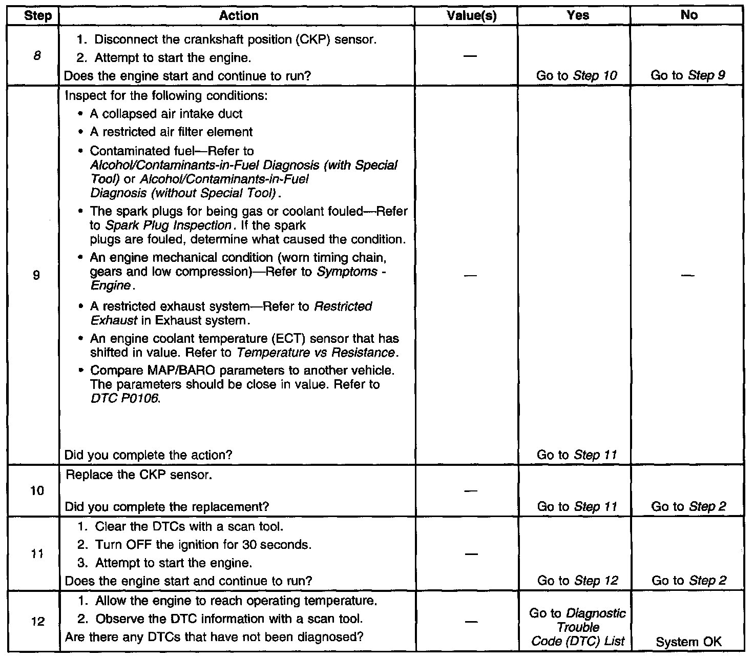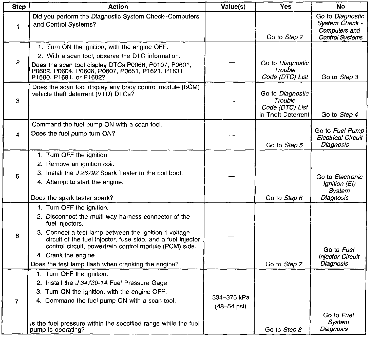 The Engine Cranks but Does Not Run diagnostic table is an organized approach to identifying a condition that causes an engine not to start. The Engine Cranks but Does Not Run diagnostic table directs the service technician to the appropriate system diagnosis.