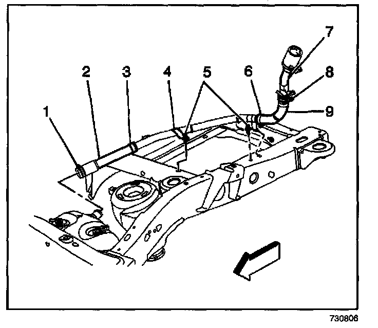 6. Disconnect the EVAP vapor pipe from the fill limiter vent valve (4), and the front and rear rollover valves (2, 6).