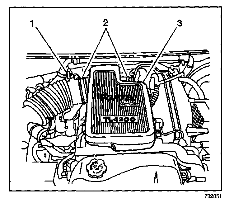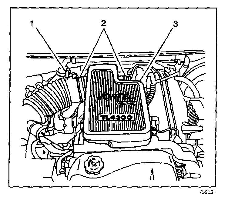 1. Loosen the air cleaner outlet duct and air cleaner outlet resonator clamps (2).