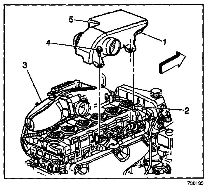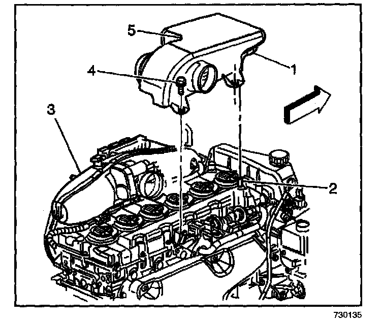7. Remove the air cleaner outlet resonator assembly (5) from the engine.
