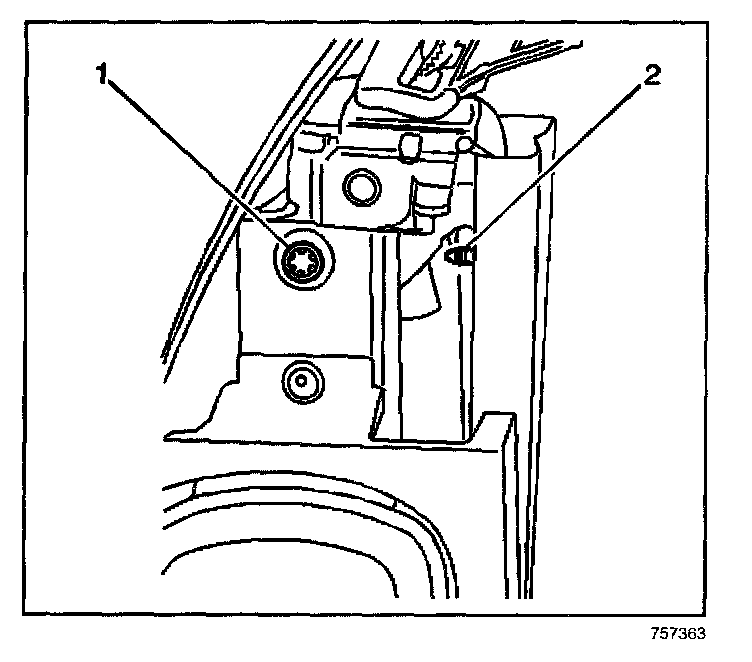 6. Remove the push pin (2) securing the top of the seat belt retractor assembly to the seat back frame.