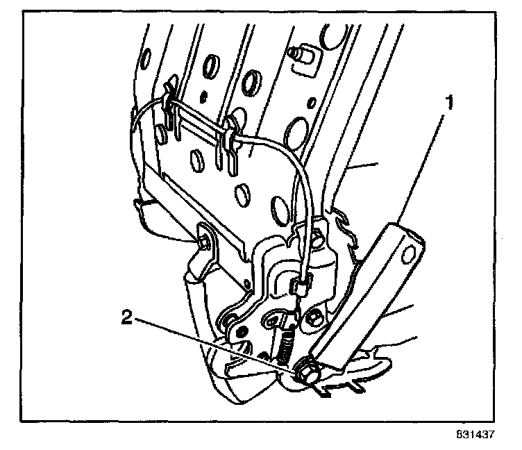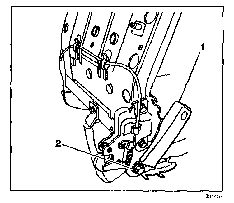 1. Install the seat belt side buckle (1) to the seat with the seat belt anchor nut (2).