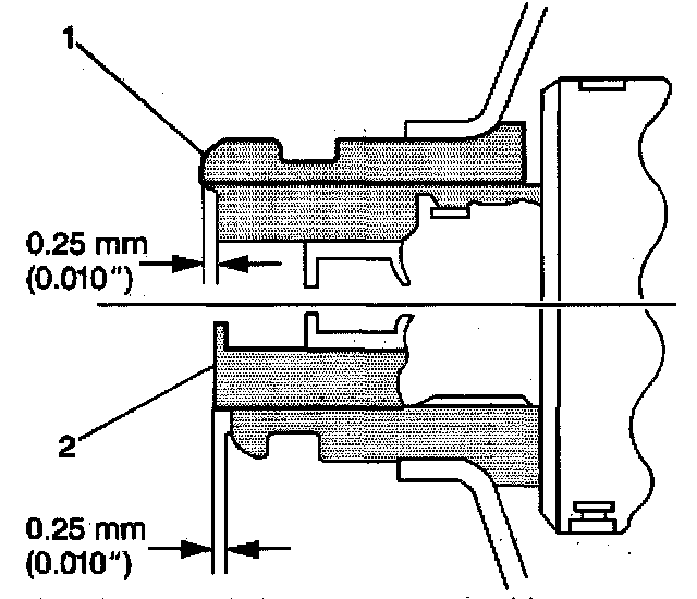 3. Install the power steering pump pulley (1) flush against the end of the power steering pump shaft (2), with an allowable variance of 0.25 mm (0.010 inch).