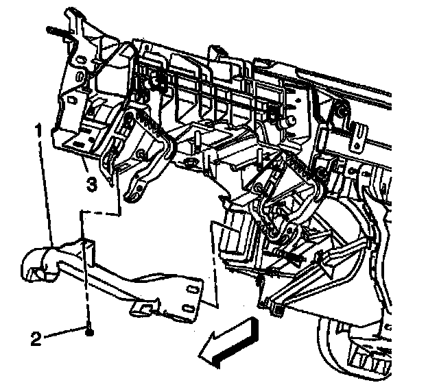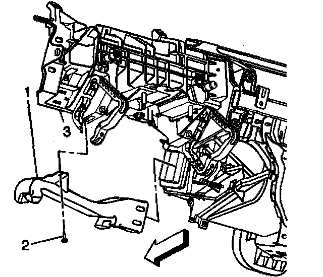 7. Remove the retaining screw (2) from the left HVAC floor duct (1).