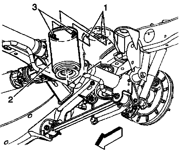 2. Install the air spring (2) to the frame by aligning the mounting tabs (3) with the keyhole slots (1) in the upper spring seat.