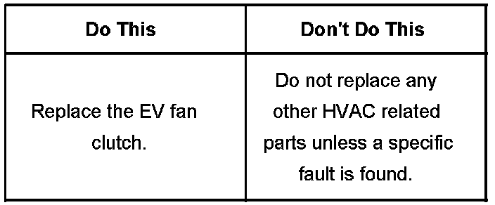 Proper diagnosis of any customer concern is essential. Refer to the Diagnostic Starting Point-Heating, Ventilation and Air Conditioning procedure in SI to begin a diagnosis of any HVAC concerns. Refer to the Diagnostic Starting Point-Engine Cooling procedure in SI to begin a diagnosis of any engine cooling or engine cooling fan concerns. If an attempt is made to diagnose an HVAC system concern, all parameters must be measured. As an example, both the low and high side refrigerant pressure readings must be measured. If only the low side pressure readings were measured, it would appear that the A/C compressor is disengaging at a higher pressure than expected. If both the low and high side pressures were being measured, it would be noted that the A/C compressor is probably disengaging due to the maximum high side pressure cut out point being reached. This occurs to protect the HVAC system from damage. The updated PCM software calibration along with the updated EV fan clutch will improve this condition due to increased air flow across the condenser. The new EV fan clutch has an increased minimum operating fan speed and an improved response time. Additional engine cooling fan noise can be expected with the updated PCM software calibrations.
