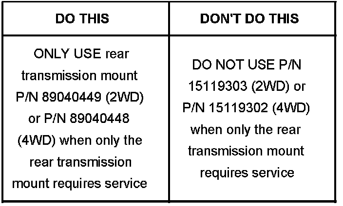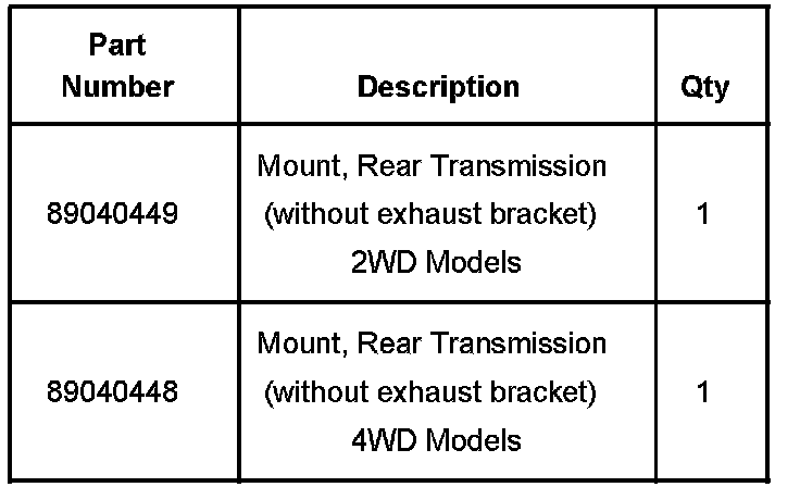 The purpose of this service bulletin is to announce the availability of the rear transmission mount without the exhaust mount bracket included. Previously when ordering the rear transmission mount from GMSPO, it could only be ordered with the exhaust mount bracket included. Currently, you can order the rear transmission mount without the exhaust mount bracket from GMSPO. When service requires the replacement of only the rear transmission mount and not the exhaust mount, order P/N 89040449 (2WD) and P/N 89040448 (4WD).