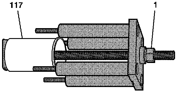 3. Align the shoe (1) of the cylinder bore sleeve puller EN 45680-402 to the bottom of the cylinder bore sleeve (117).