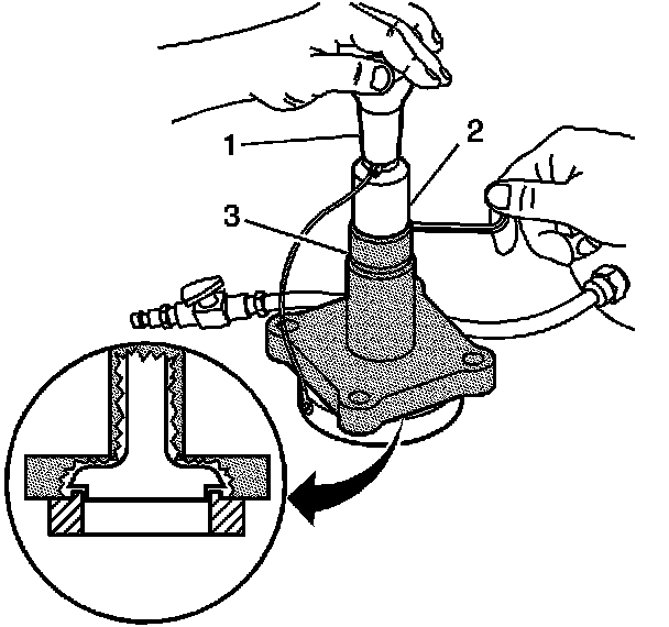 13. Connect a compressed air supply 517-862 kPa (75-125 psi) to the male quick connect (3) located on trim tool assembly EN 45680-411. Turn the compressed air valve (2) to the open position. This starts the venturi vacuum system that will catch the metal shavings.