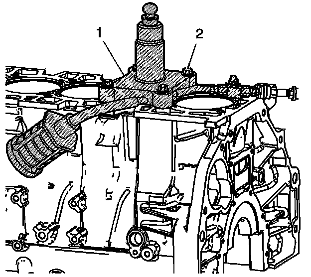 8. Install and tighten the 4 attaching bolts (2) into the cylinder head bolt holes of the block.